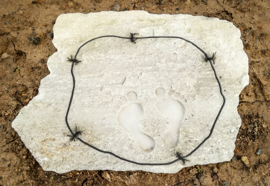 These footprints are surrounded by barbed wire, an evocative reminder that oppression, in all its forms, still persists in our world today. This barbed wire doesn't just indicate physical boundaries. It represents the complex web of social, economic, political, and personal constraints that have perpetuated various forms of oppression, including contemporary issues such as migration and ongoing global crises.
